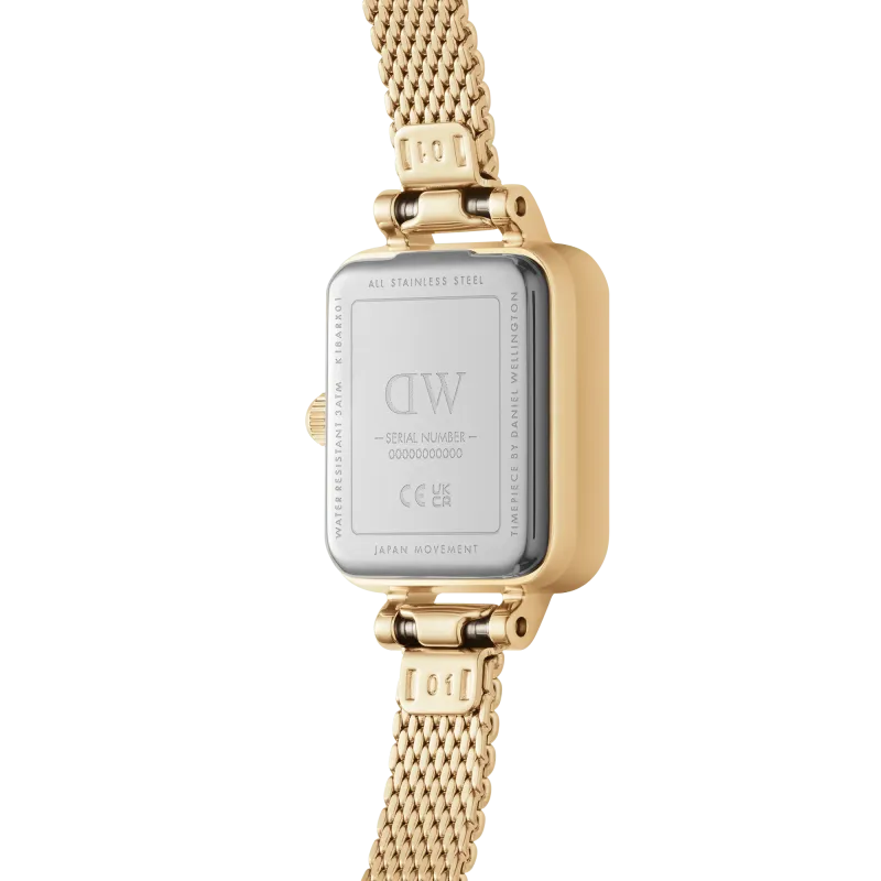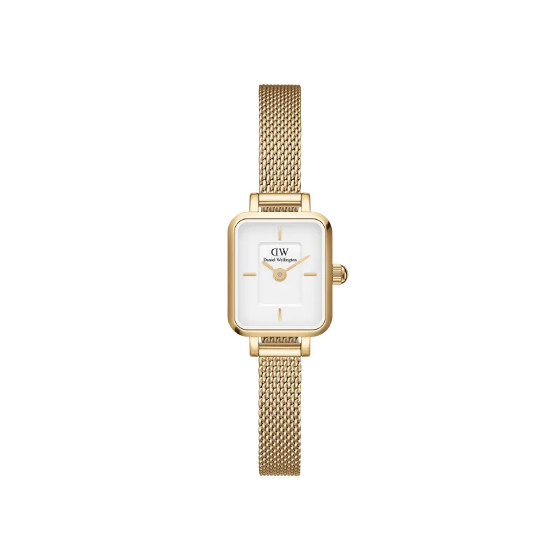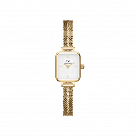 Los elegantes bordes angulares del Quadro, reducidos a su mínima expresión en nuestro reloj más pequeño hasta la fecha. Esta versión del Quadro Mini presenta nuestra combinación de colores más clásica, con una correa de malla dorada intercambiable.