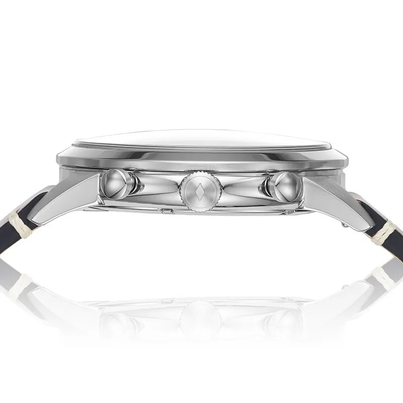 ESFERA: Color azul marino satinado con cifras y agujas en color dorado. Dos esferas para el cronómetro.