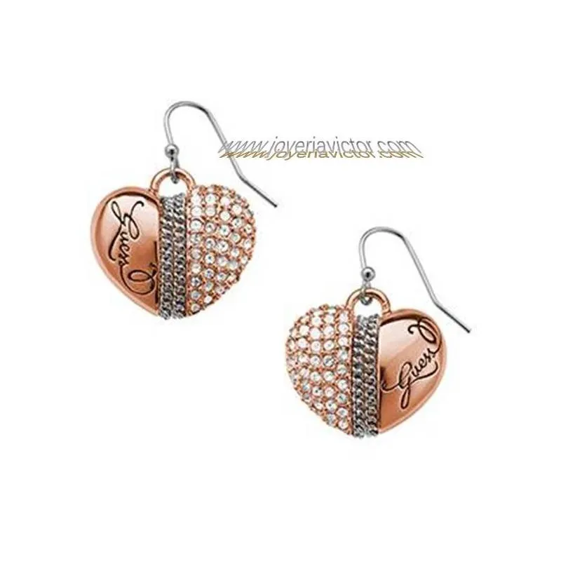 Pendientes color oro rosa con corazón de 20mm (aproximadamente) con piedras de Swarovski blancas en una mitad y en la otra el logo de Guess.