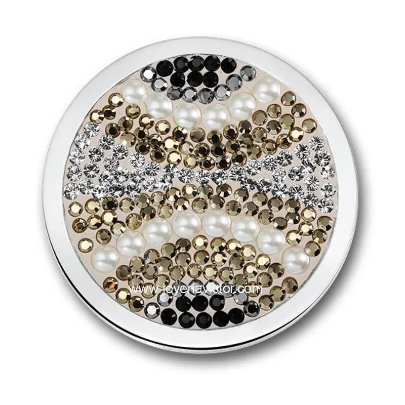 Moneda de acero con cristales de Swarovski y medias perlas, formando dibujos en tonos metalicos.