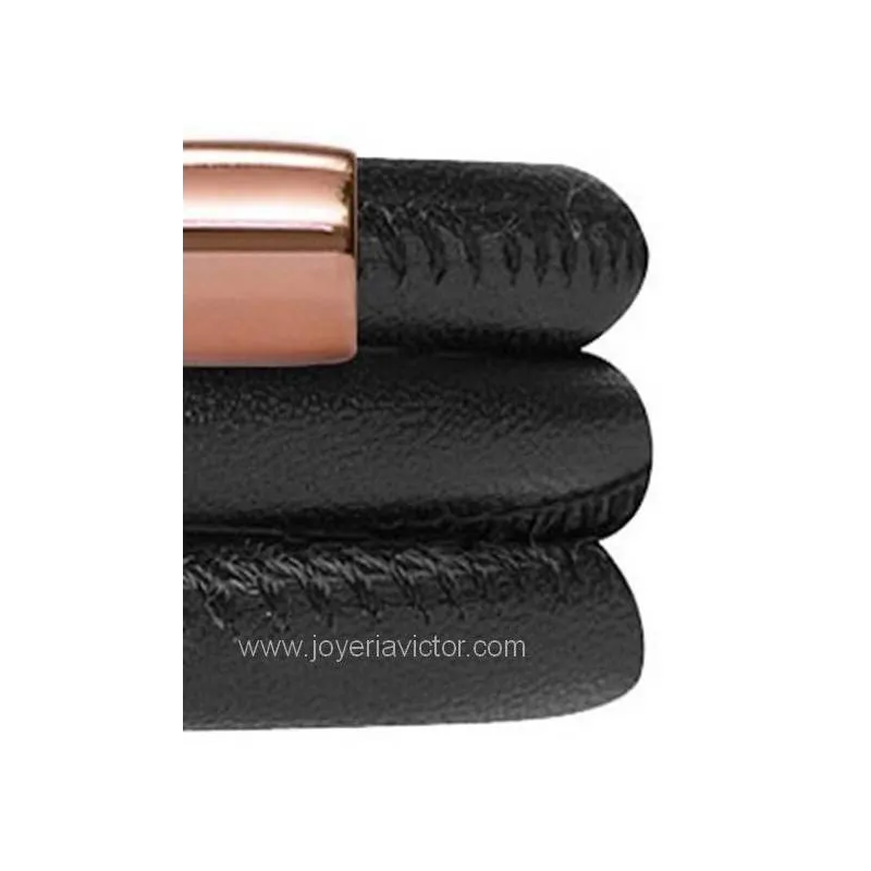 Pulsera de cuero de 0.7cm de grosor. Cierre de acero chapado en oro rosa de 3 micras, embutido con imán.