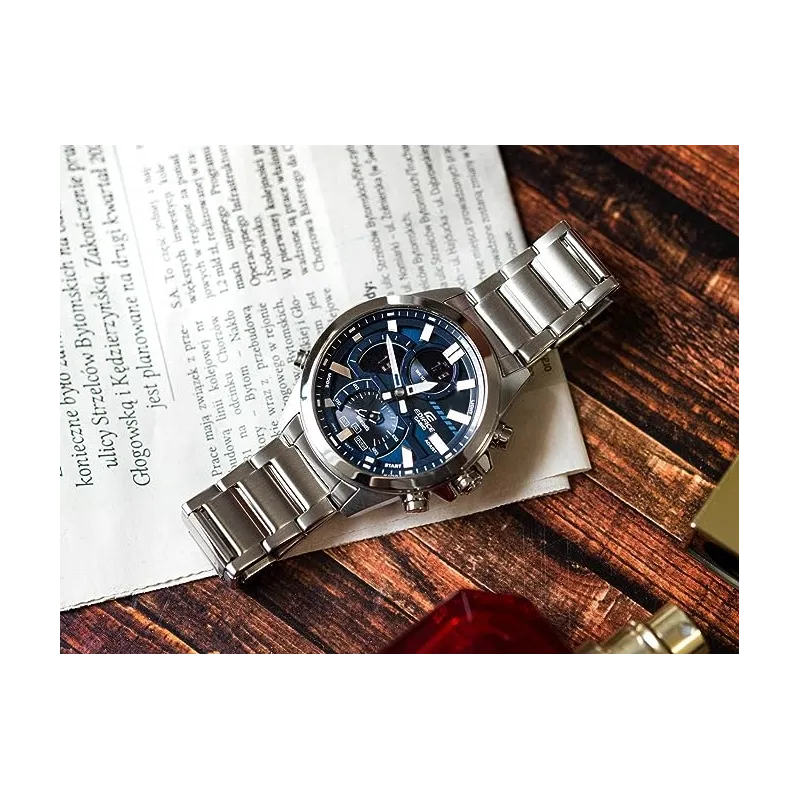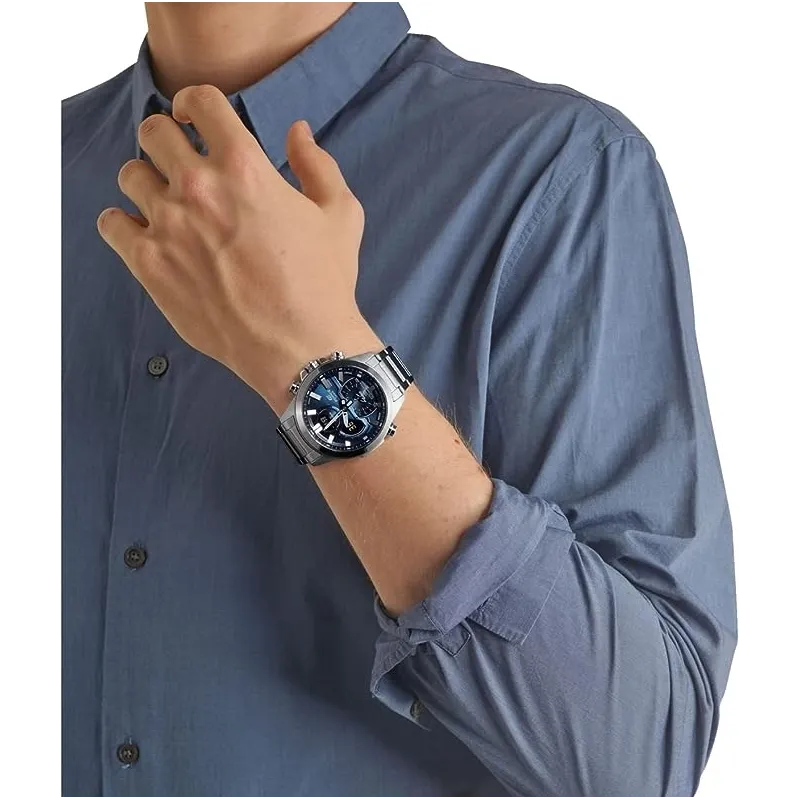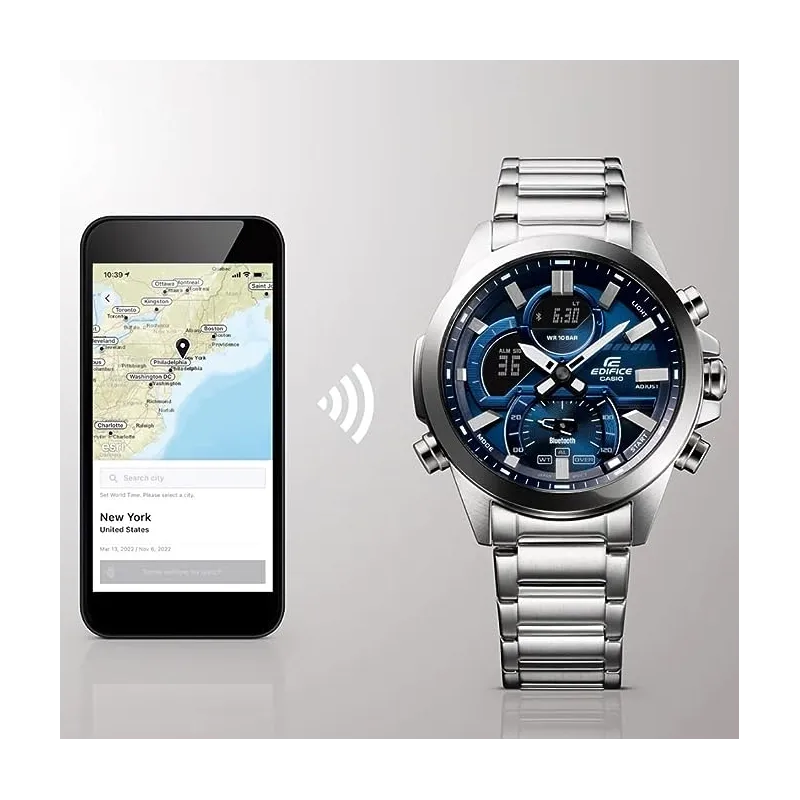 Bienvenido a la evolución de Speed & Intelligence: la belleza de alta tecnología y altas especificaciones del cronógrafo metálico EDIFICE con estilo serio y conectividad de teléfono inteligente sin esfuerzo. El ECB-30D-2AEF, es muy fácil sincronizar con su teléfono inteligente a través de Bluetooth® y acceder a la aplicación CASIO WATCHES para tener la funcionalidad completa al alcance de su mano. La aplicación garantiza un cronometraje de precisión sin botones cuando su teléfono está cerca. Desarrollado para satisfacer las necesidades de los equipos de carreras, el temporizador de programación se sincroniza con la aplicación de calendario de su teléfono inteligente para transmitir los elementos de la programación al teléfono y mostrar las horas de inicio y finalización en la pantalla LCD del reloj. Equipado con luz LED que se ilumina con solo inclinar la muñeca. Inspirado en el auto deportivo, el diseño de la cara mecánica realza la profundidad y la dimensionalidad para evocar el aspecto dinámico,