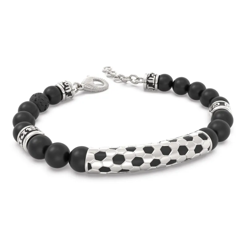 El ónix negro, piedra preciosa de origen volcánico, pertenece a la familia de la calcedonia. Su nombre, “ónix”, tiene raíces en el griego antiguo y deriva de la palabra “onux”, que significa “uña” o “garra”, lo que enfatiza la notable dureza de esta piedra. También conocida como la "piedra de la madurez", el Ónix Negro se asocia con una energía poderosa y es particularmente adecuado para aquellos que ya poseen una gran fuerza de carácter y un notable equilibrio interior. En esta pulsera el ónix está arenado.