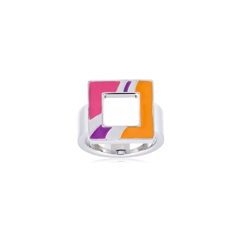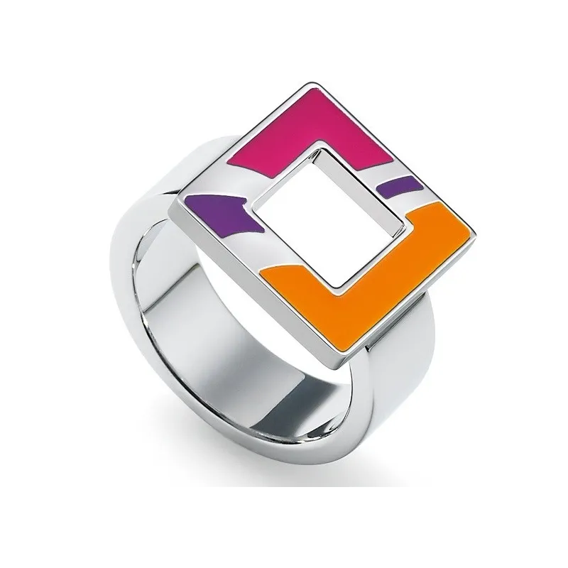 Anillo acero 316L con esmalte en lineas de color naranja, rosa y violeta.