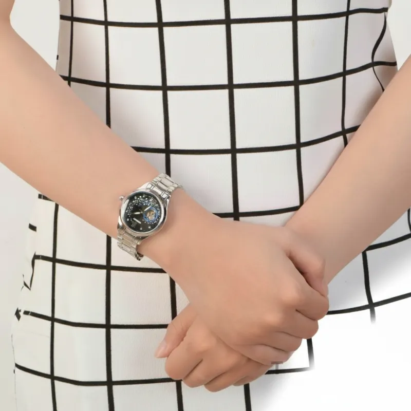 ESFERA: Color negro con horas y agujas en acero con piedras brillantes. La esfera muestra el cielo nocturno con estrellas y una luna. Los colores de las estrellas brillan cuando mueves el reloj. ¡Precioso!.