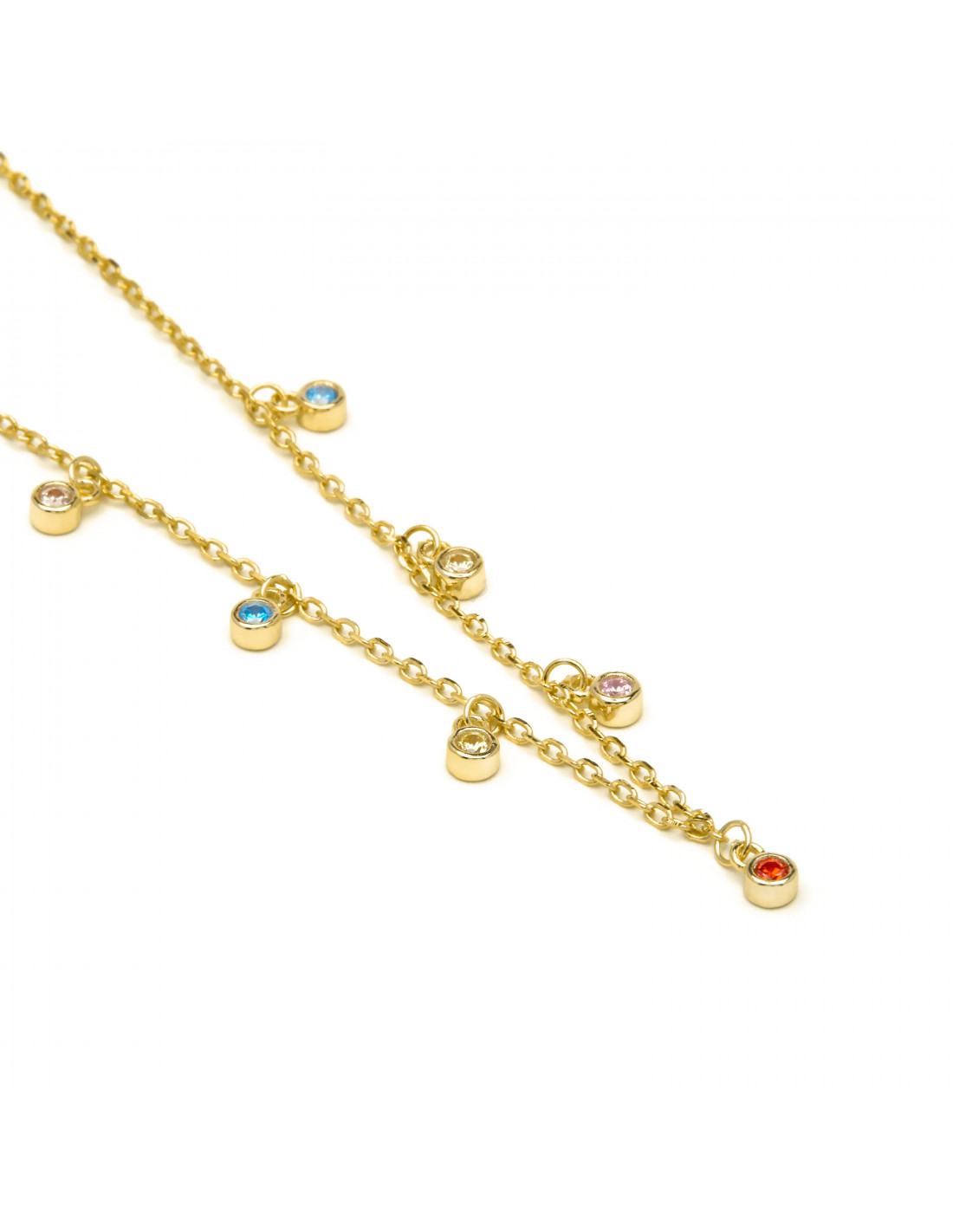 Material: Plata de Ley 925; Acabado: Oro; Piedra: Circonita Brillante multicolor. Largo del collar: 42cm + 3cm de extensión; Cierre: Mosquetón.