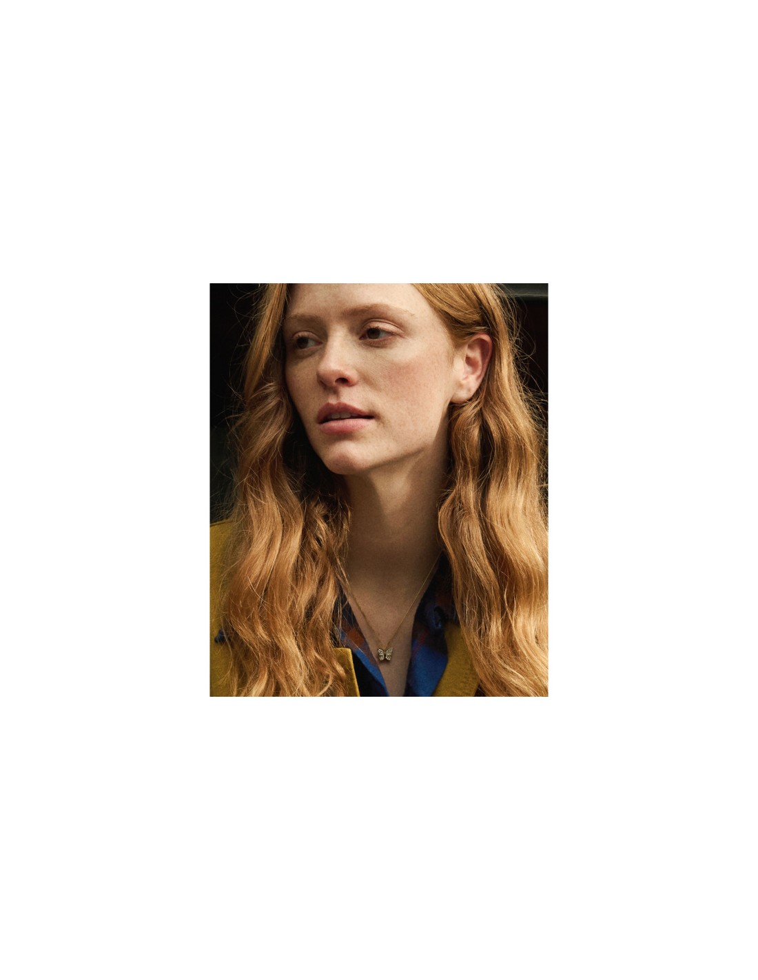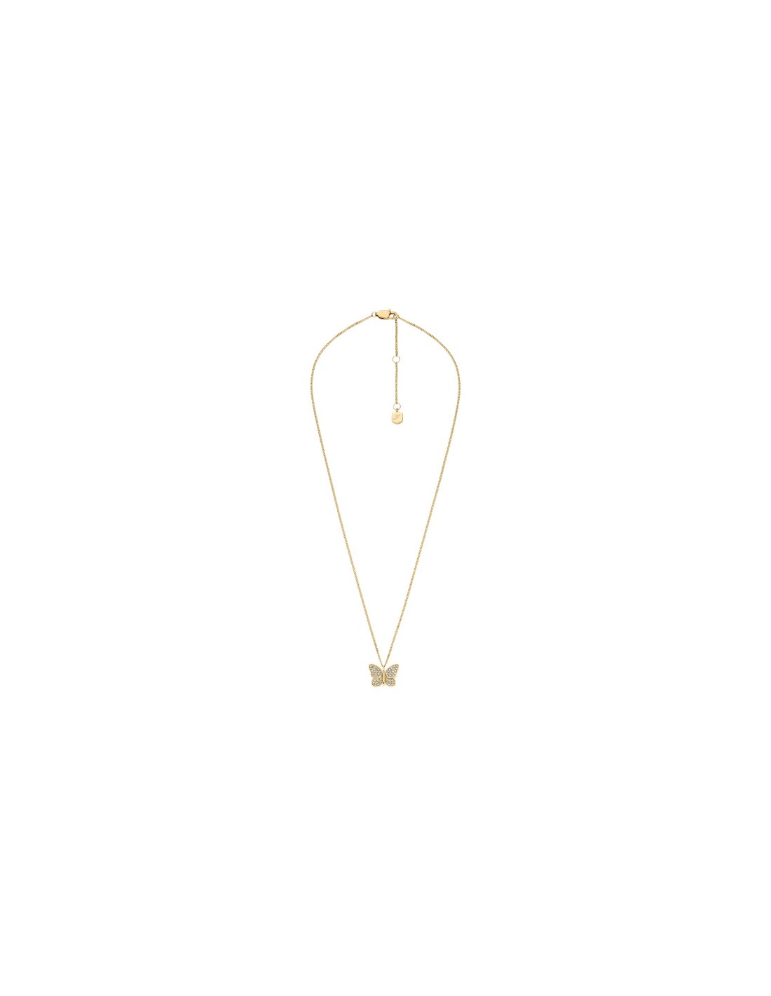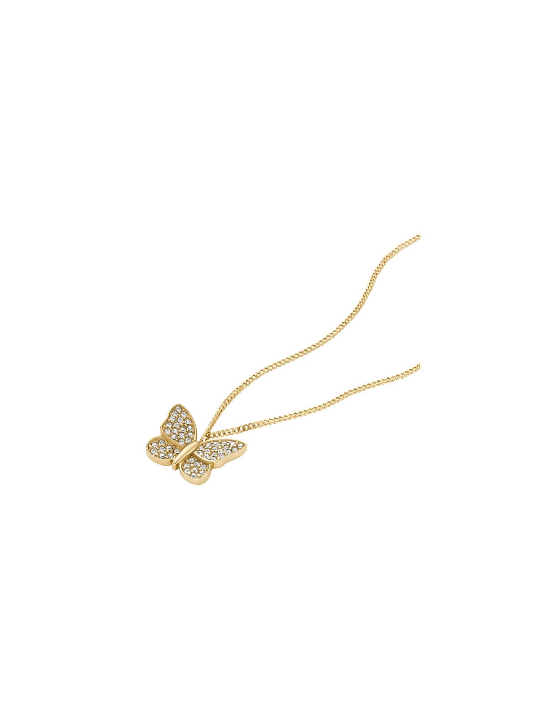 Cadena de acero chapado en oro amarillo con colgante con forma de mariposa y piedras en las alas.