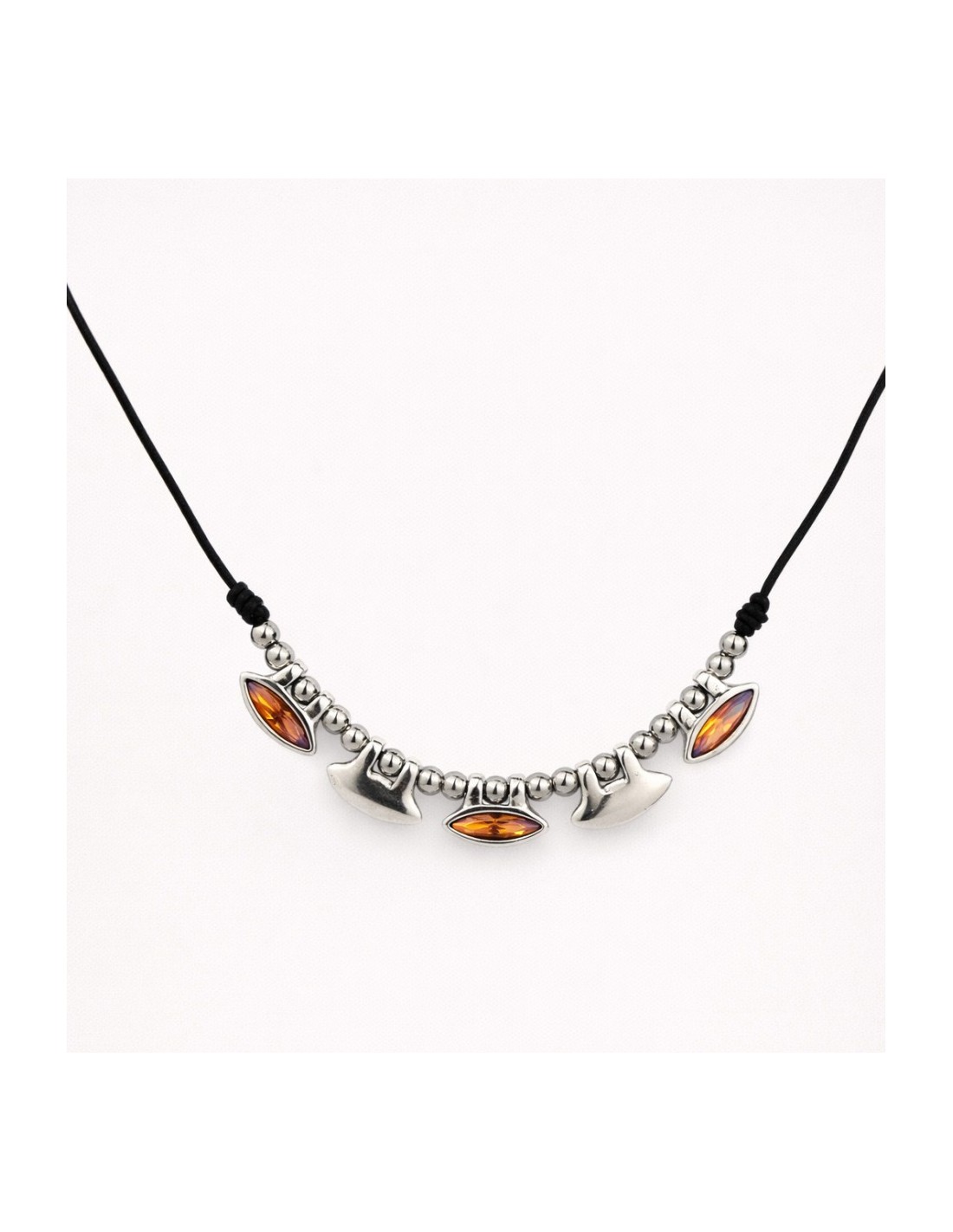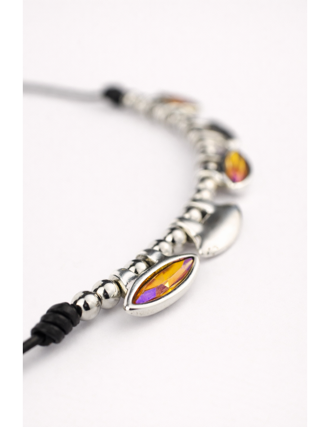 Collar Alhelí corto de cuero y plata con vainas y cristales facetados en tres colores, bolas de acero y cierre mosquetón. Ajustable, artesanal y con estilo propio.