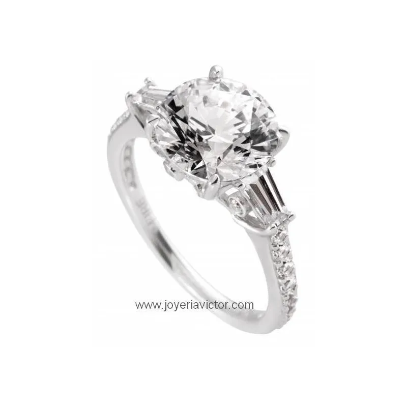 Anillo de Plata de Ley con tres capas de chapado (paladio-platino-rodio). Piedra principal de 10mm a la que se le añaden 24 zirconias con un peso total de 4.85 Kilates.