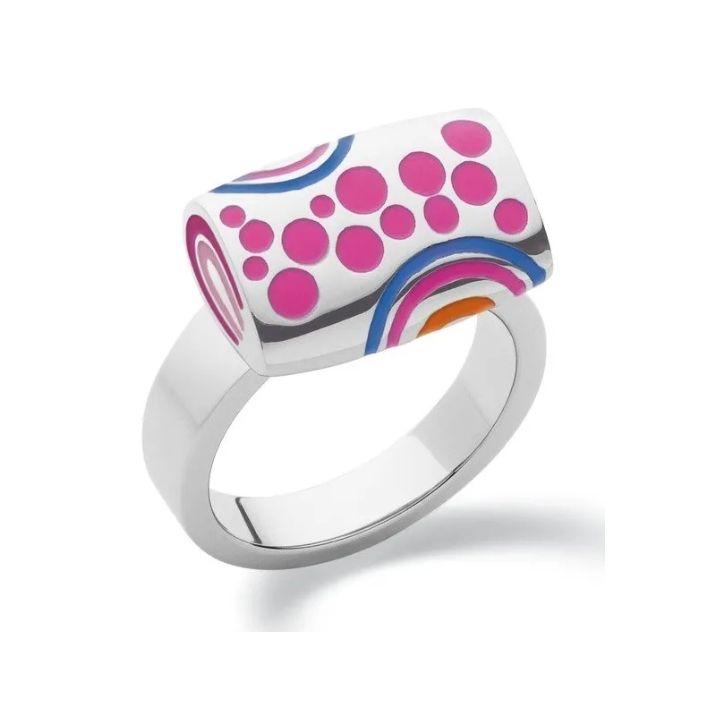 Anillo acero 316L con forma de bolsito y esmaltes rosas azules y naranja.