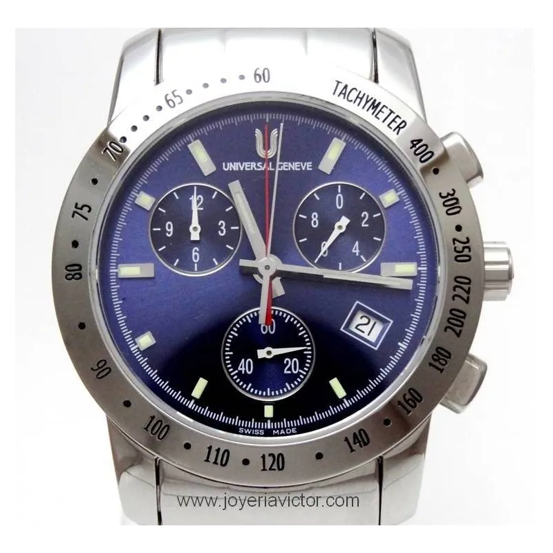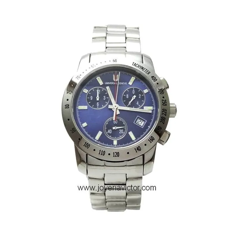 Universal Geneve con caja y pulsera de acero con Cronógrafo de 12 horas(1/10 segundo), con funciones de pausa y lapsos de tiempo, calendario y cristal de Zafiro antireflejos. Esfera de color azul. Pulsera con cierre oculto y botones de apertura automática. La corona es a rosca y es resistente a 100m.