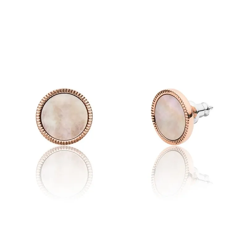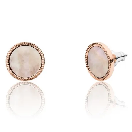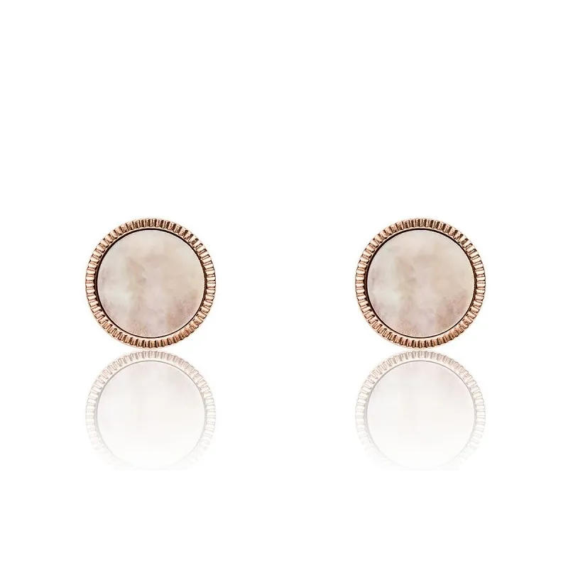 Pendientes de acero chapado en oro rosa con nácar (madre perla) interior. Diámetro aproximado de 10mm.