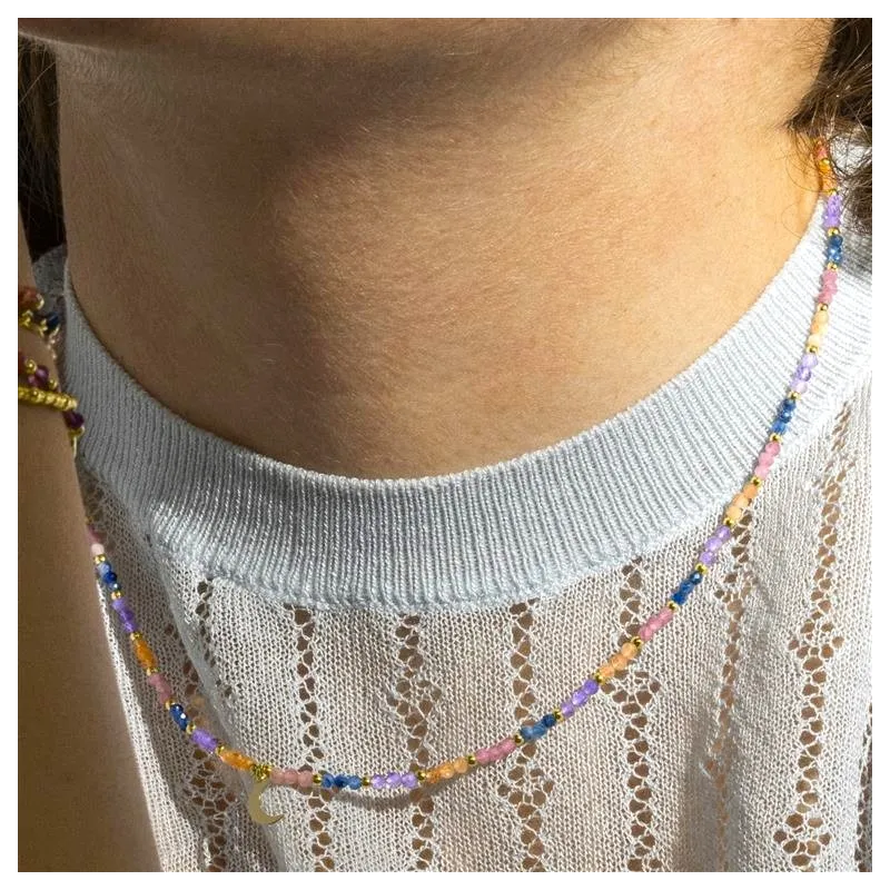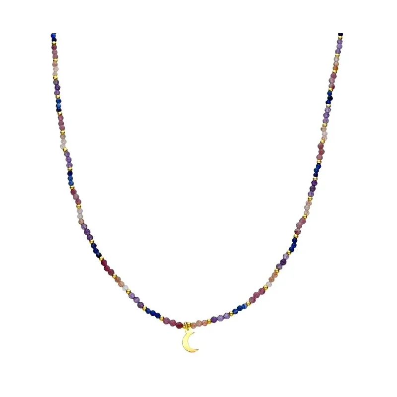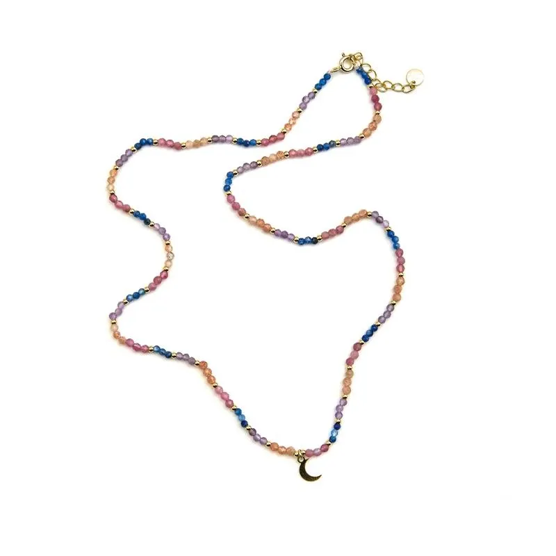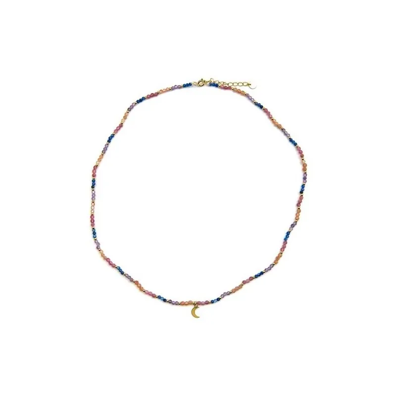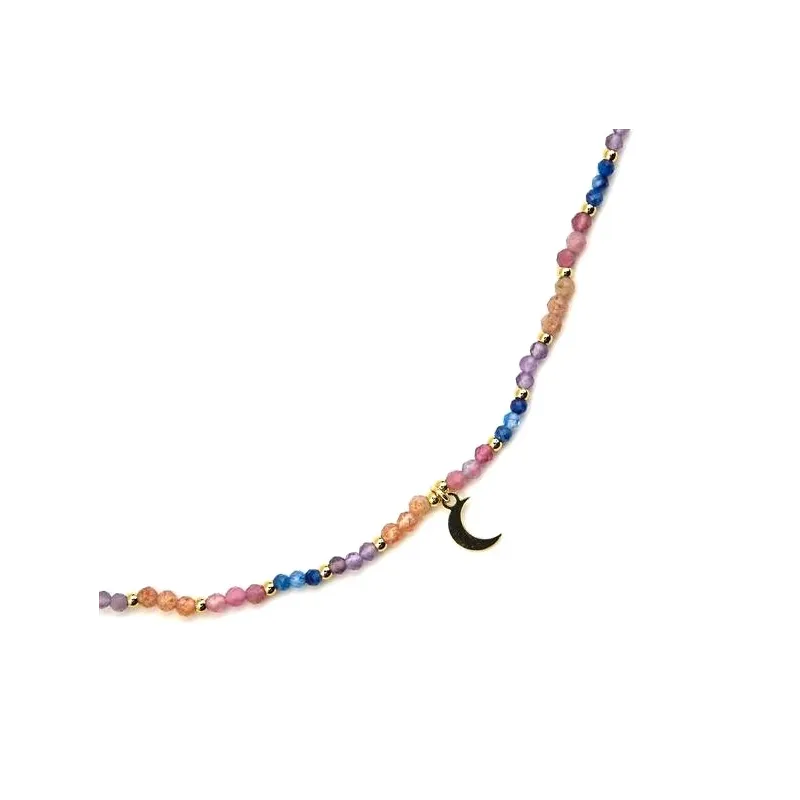 Material: Plata de ley 925;Acabado: Oro amarillo de 18k;Piedra: Cristal multicolor; Largo: 42 Cm + 3 Cm de extensión; Colgante de luna: 7x5mm;Peso: 0,26 gr