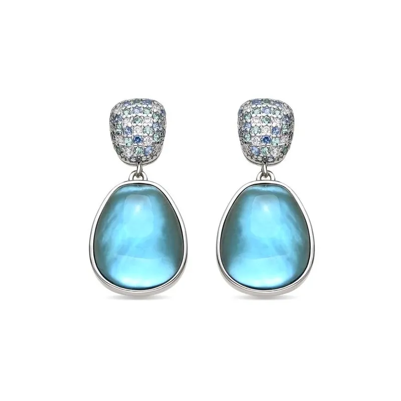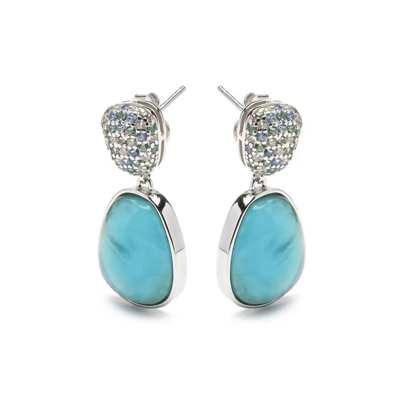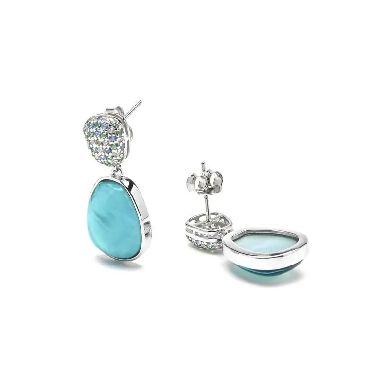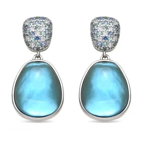 Material: Plata de Ley 925; Acabado: Rodio; Piedras: Cristal Azul; Medidas del pendiente: 27mm de largo x 13mm de ancho; Cierre: Presión; Peso: 4,21gr.