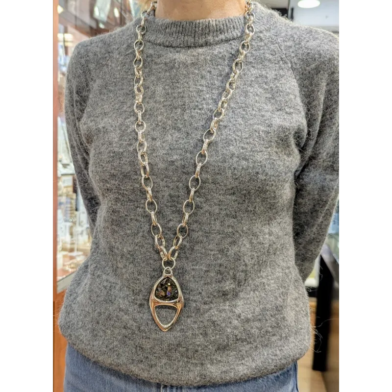 La cadena de eslabones grandes, con sus 106 cm de longitud, aporta un aire moderno y audaz, permitiendo llevarlo solo o en combinación con otras piezas. Su cierre de mosquetón garantiza un ajuste cómodo y seguro.