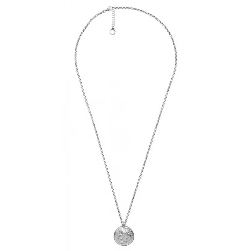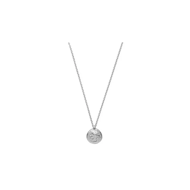 El collar largo Giselle, está formado por una cadena fina bañada en plata y adornado con un motivo grande con diseño de moneda. Regulable de 80 cm a 85 cm y con cierre mosquetón, es una pieza versátil que complementa cualquier atuendo.