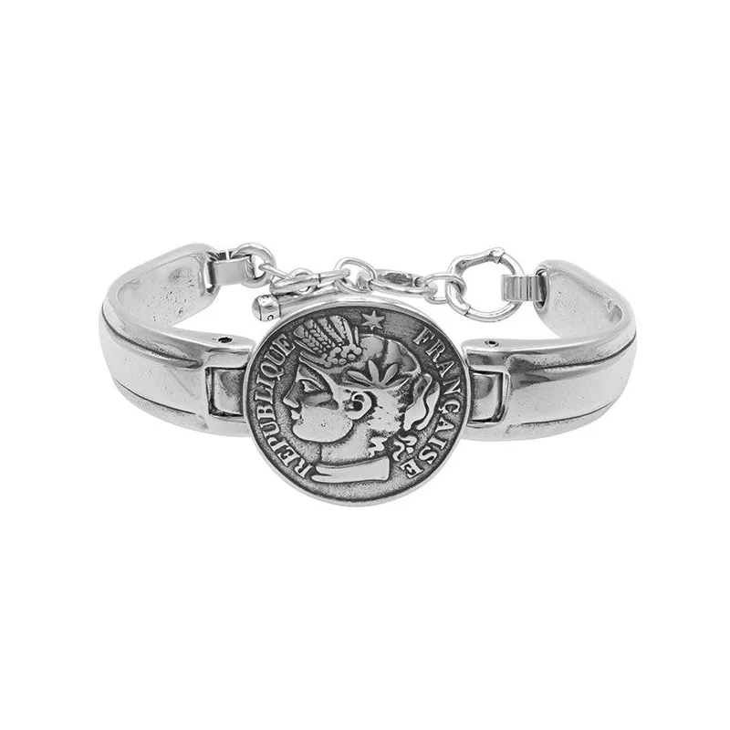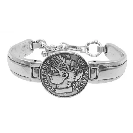 Un diseño semi rígido bañado en plata con motivo central de moneda. Una nueva pieza que se añade a nuestra colección France, top ventas desde hace años.