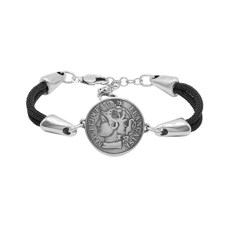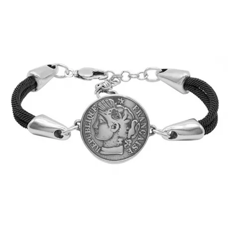 Diseño en doble cordón negro con motivo de moneda en plata. Un toque rompedor en nuestra famosa colección France.